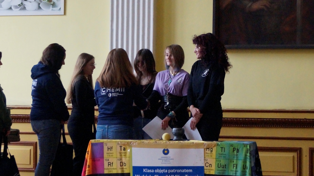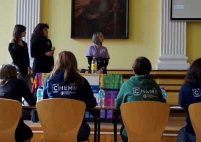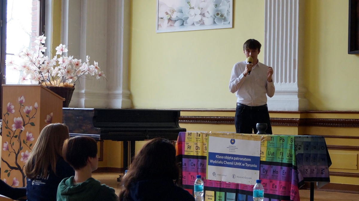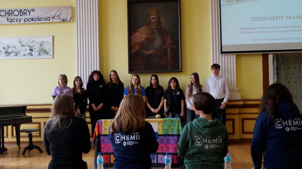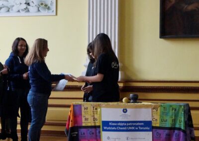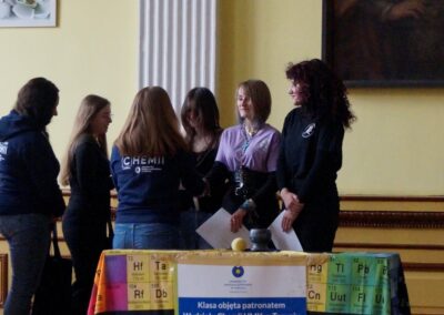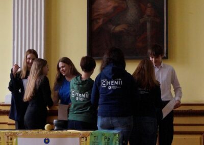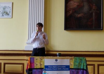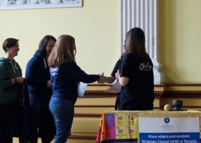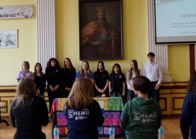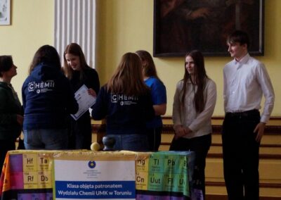 W ramach wydarzenia odbyły się różnorodne pokazy chemiczne, przeprowadzone przez naszych uczniów przy wsparciu pana Łukasza Reimusa. Ukazały one chemię jako pasjonującą naukę obecną w naszym codziennym życiu. W czasie tego dnia mieliśmy okazję gościć w naszej szkole, wybitnych naukowców z UMK: dr.hab. Sylwię Studzińską, dr.hab. Beatę Kaczmarek-Szczepańską oraz dr. Joannę Skopińską-Wiśniewską. Dodatkowo odwiedziła nas nasza absolwentka – p. Julia. Nasi goście utworzyli jury konkursowe w tegorocznym konkursie.