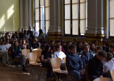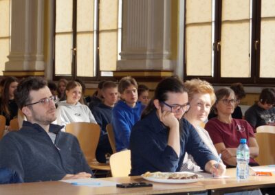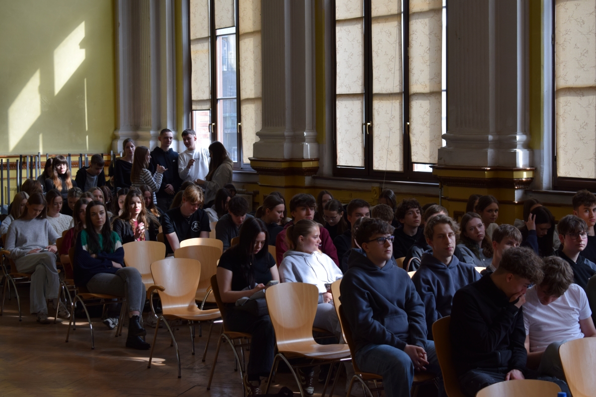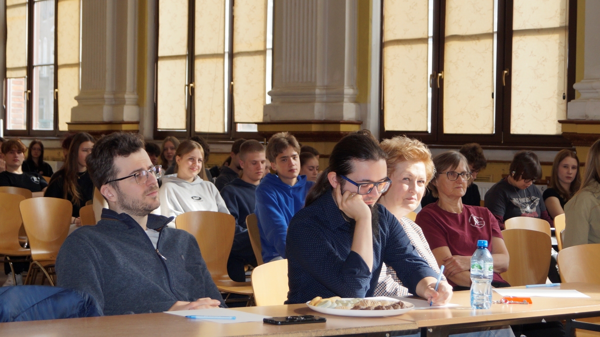 Ukoronowaniem imprezy był wykład pt. “Zawód - fizyk” wygłoszony przez gościa z UMK pana dr. inż. M. Narożnika, w którym wzięli udział uczniowie rozszerzający fizykę w I LO.